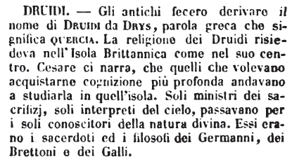 | Druidi - Gli antichi fecero derivare il nome di Druidi da Drys, parola greca che significa quercia. La religione dei Druidi risiedeva nell'Isola Britannica come nel suo centro. Cesare ci narra, che quelli che volevano acquistarne cognizione più profonda andavano a studiarla in quell'isola. Soli ministri dei sacrifizj, soli interpreti del cielo, passavano per i soli conoscitori della natura divina. Essi erano i sacerdoti ed i filosofi dei Germanni, dei Brettoni e dei Galli. [immagine] |