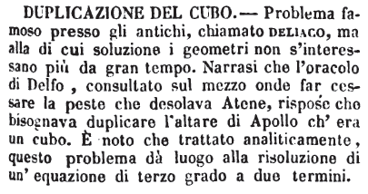 | Duplicazione del cubo - Problema famoso presso gli antichi, chiamato deliaco, ma alla di cui soluzione i geometri non s'interessano più da gran tempo. Narrasi che l'oracolo di Delfo, consultato sul mezzo onde far cessare la peste che desolava Atene, rispose che bisognava duplicare l'altare di Apollo ch' era un cubo. E' noto che trattato analiticamente, questo problema dà luogo alla risoluzione di un'equazione di terzo grado a due termini. [immagine] |