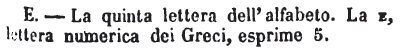 | E - La quinta lettera dell'alfabeto. La E, lettera numerica dei Greci, esprime 5. [immagine] |