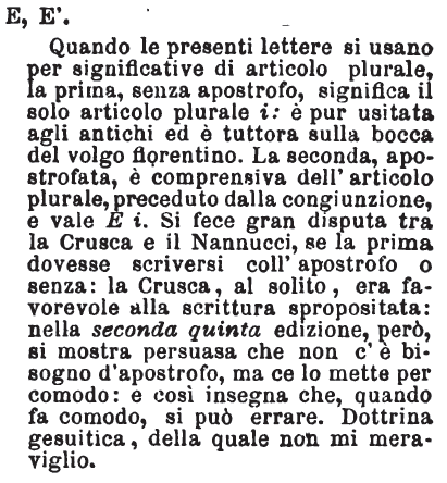 | E, E’ - Quando le presenti lettere si usano per significative di articolo plurale, la prima, senza apostrofo, significa il solo articolo plurale i: è pur usitata agli antichi ed è tuttora sulla bocca del volgo fiorentino. La seconda, apostrofata, è comprensiva dell'articolo plurale, preceduto dalla congiunzione, e vale E i. Si fece gran disputa tra la Crusca e il Nannucci, se la prima dovesse scriversi coll'apostrofo o senza: la Crusca, al solito, era favorevole alla scrittura spropositata: nella seconda quinta edizione, però, si mostra persuasa che non c'è bisogno d'apostrofo, ma ce lo mette per comodo: e così insegna che, quando fa comodo, si può errare. Dottrina gesuitica, della quale non mi meraviglio. [immagine] |