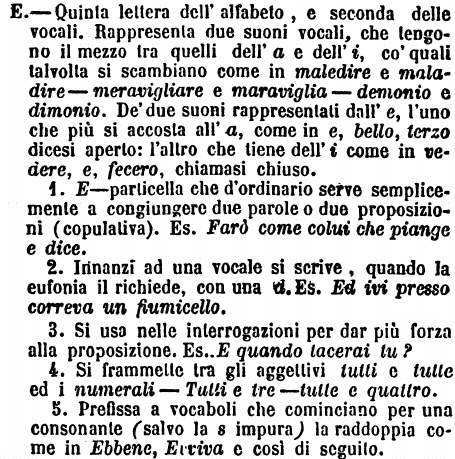 | E - Quinta lettera dell'alfabeto, e seconda delle vocali. Rappresenta due suoni vocali, che tengono il mezzo tra quelli dell'a e dell'i, co' quali talvolta si scambiano come in maledire e maladire - meravigliare e maraviglia - demonio e dimonio. De' due suoni rappresentati dall'e, l'uno che più si accosta all'a, come in e, bello, terzo dicesi aperto: l'altro che tiene dell'i come in vedere, e, fecero, chiamasi chiuso.