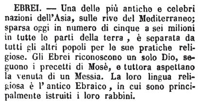 | Ebrei - Una delle più antiche e celebri nazioni dell'Asia, sulle rive del Mediterraneo; sparsa oggi in numero di cinque a sei milioni in tutte le parti della terra, è separata da tutti gli altri popoli per le sue pratiche religiose. Gli Ebrei riconoscono un solo Dio, seguono i precetti di Mosè, e tuttora aspettano la venuta di un Messia. La loro lingua religiosa è l'antico Ebraico, in cui sono principalmente istruiti i loro rabbini. [immagine] |