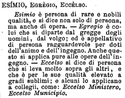 | Esimio, Egregio, Eccelso - Esimio è persona di rare e nobili qualità, e si dice non solo di persona, ma anche di opera. - Egregio è colui che si diparte dal gregge degli uomini, dal volgo; ed è appellativo di persona ragguardevole per doti dell'animo e dell'ingegno. Anche questo si applica pure alle opere dell'ingegno. - Eccelso si dice di persona che si leva molto sopra gli altri, e che è per le sue qualità elevato a gradi sublimi; e alcuni lo applicano a collegii, come: Eccelso Ministero, Eccelso Municipio. [immagine] |