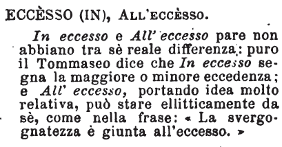 | Eccesso (in), All’eccesso - In eccesso e All'eccesso pare non abbiano tra sè reale differenza: puro il Tommaseo dice che In eccesso segna la maggiore o minore eccedenza; e All'eccesso, portando idea molto relativa, può stare ellitticamente da sè, come nella frase: «La svergognatezza è giunta all'eccesso.» [immagine] |