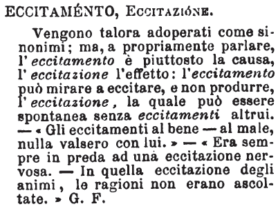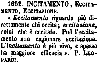 | Incitamento, Eccitamento, Eccitazione - «Eccitamento riguarda più direttamente chi eccita; eccitazione, colui che è eccitato. Può l'eccitamento non cagionare eccitazione. L'incitamento è più vivo, e spesso ha maggiore efficacia». P. Leopardi. [immagine] |