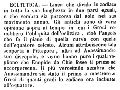 | Eclittica - Linea che divide lo zodiaco in tutta la sua lunghezza in due parti eguali, e che sembra sia percorsa dal sole nel suo movimento annuo. Gli antichi sono di varia opinione sopra al tempo in cui i Greci conobbero l'obliquità dell'eclittica, cioè l'angolo che fa il piano di quella curva con quella dell'equatore celeste. Alcuni attribuiscono tale scoperta a Pittagora, altri ad Anassimandro suo discepolo, e ve ne hanno pure i quali vogliono che Enopide da Chio fosse il primo ad accorgersene. Il più verosimile sembra che Anassimandro sia stato il primo a mostrare ai Greci di quanti gradi lo zodiaco era inclinato all'equatore. [immagine] |