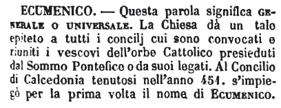 | Ecumenico - Questa parola significa generale o universale. La Chiesa dà un tale epiteto a tutti i concilj cui sono convocati e riuniti i vescovi dell'orbe Cattolico presieduti dal Sommo Pontefice o da suoi legati. Al Concilio di Calcedonia tenutosi nell'anno 451. s'impiegò per la prima volta il nome di Ecumenico. [immagine] |