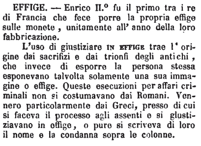 L'uso di giustiziare in effige trae l'origine dai sacrifizi e dai trionfi degli antichi, che invece di esporre la persona stessa esponevano talvolta solamente una sua immagine o effige. Queste esecuzioni per affari criminali non si costumavano dai Romani, Vennero particolarmente dai Greci, presso di cui si faceva il processo agli assenti e si giustiziavano in effige, o pure si scriveva di loro il nome e la condanna sopra le colonne. [immagine] |