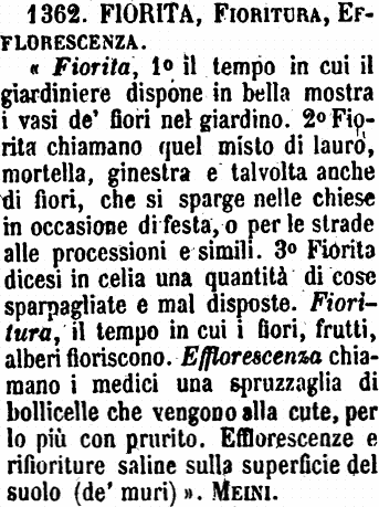 | Fiorita, Fioritura, Efflorescenza - «Fiorita, 1° il tempo in cui il giardiniere dispone in bella mostra i vasi de' fiori nel giardino. 2° Fiorita chiamano quel misto di lauro, mortella, ginestra e talvolta anche di fiori, che si sparge nelle chiese in occasione di festa, o per le strade alle processioni e simili. 3° Fiorita dicesi in celia una quantità di cose sparpagliate e mal disposte. Fioritura, il tempo in cui i fiori, frutti, alberi fioriscono. Efflorescenza chiamano i medici una spruzzaglia di bollicelle che vengono alla cute, per lo più con prurito. Efflorescenze e rifioriture saline sulla superficie del suolo (de' muri)». Meini [immagine] |