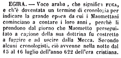 | Egira - Voce araba, che significa fuga, e ch'è doventata un termine di cronologia per indicare la grande epoca da cui i Maomettani cominciano a contare i loro anni, perchè li prendono dal giorno che Maometto perseguitato a cagione della sua dottrina fu costretto a fuggire e ad uscire dalla Mecca. Secondo alcuni cronologisti, ciò avvenne nella notte dal 15 al 16 luglio dell'anno 622 dell'era cristiana. [immagine] |
