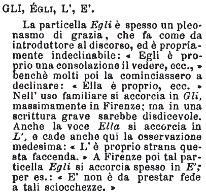 | Gli, Egli, L’, E’ - La particella Egli è spesso un pleonasmo di grazia, che fa come da introduttore al discorso, ed è propriamente indeclinabile: «Egli è proprio una consolazione il vedere, ecc.,» benchè molti poi la cominciassero a declinare: «Ella è proprio, ecc.» Nell'uso familiare si accorcia in Gli, massimamente in Firenze; ma in una scrittura grave sarebbe disdicevole. Anche la voce Ella si accorcia in L', e cade anche qui la osservazione medesima: «L'è proprio strana questa faccenda.» A Firenze poi tal particella Egli si accorcia spesso in E'; per es.: «E' non è da prestar fede a tali sciocchezze.» [immagine] |