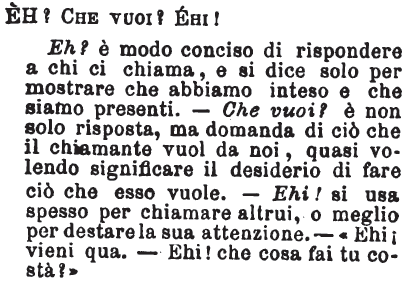 | Èh? Che vuoi? Èhi! - Eh? è modo conciso di rispondere a chi ci chiama, e si dice solo per mostrare che abbiamo inteso e che siamo presenti. - Che vuoi? è non solo risposta, ma domanda di ciò che il chiamante vuol da noi, quasi volendo significare il desiderio di fare ciò che esso vuole. - Ehi! si usa spesso per chiamare altrui, o meglio per destare la sua attenzione. - «Ehi! vieni qua. - Ehi! che cosa fai tu costà?» [immagine] |