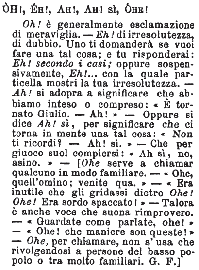 | Oh!, Eh!, Ah!, Ah! sì, Ohe! - Oh! è generalmente esclamazione di meraviglia. - Eh! di irresolutezza, di dubbio. Uno ti domanderà se vuoi fare una tal cosa; e tu risponderai: Eh! secondo i casi; oppure sospensivamente, Eh!... con la quale particella mostri la tua irresolutezza. - Ah! si adopra a significare che abbiamo inteso o compreso: « E' tornato Giulio. - Ah! » - Oppure si dice Ah! si, per significare che ci torna in mente una tal cosa: « Non ti ricordi? - Ah! si. » - Che per giuoco suol compiersi: « Ah si, no, asino. » - [Ohe serve a chiamar qualcuno in modo familiare. - « Ohe, quell'omino; venite qua. » - « Era inutile che gli gridassi dietro Ohe! Ohe! Era sordo spaccato! » - Talora è anche voce che suona rimprovero. - « Guardate come parlate, ohe! » - « Ohe! che maniere son queste! » - Ohe, per chiamare, non s'usa che rivolgendosi a persone del basso popolo o tra molto familiari. G. F.] [immagine] |