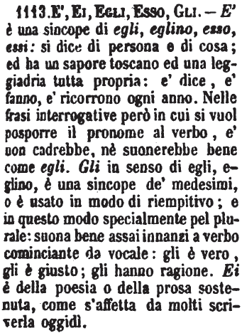 | E’, Ei, Egli, Esso, Gli - E' è una sincope di egli, eglino, esso, essi: si dice di persona e di cosa; ed ha un sapore toscano ed una leggiadria tutta propria: e' dice, e' fanno, e' ricorrono ogni anno. Nelle frasi interrogative però in cui si vuol posporre il pronome al verbo, e' non cadrebbe, nè suonerebbe bene come egli. Gli in senso di egli, eglino, è una sincope de' medesimi, o è usato in modo di riempitivo; e in questo modo specialmente pel plurale: suona bene assai innanzi a verbo cominciante da vocale: gli è vero, gli è giusto; gli hanno ragione. Ei è della poesia o della prosa sostenuta, come s'affetta da molti scriverla oggidì. [immagine] |