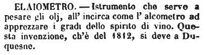 | Elaiometro - Istrumento che serve a pesare gli olj, all'incirca come l'alcometro ad apprezzare i gradi dello spirito di vino. Questa invenzione, ch'è del 1812, si deve a Duquesne. [immagine] |