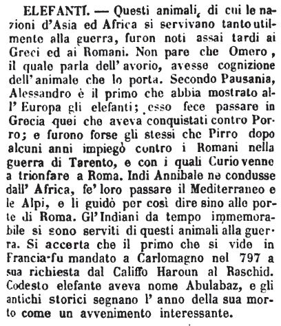 | Elefanti - Gli Antichi fecero molto uso di questi animali nei combattimenti. Posti alla testa d'un'Armata si spingevano contra i nemici, di cui rompevan le linee, e vi portavano il terrore e il disordine, schiacciando gli uni colla lor massa enorme, dando luogo ai soldati, che erano sopra lor collocati in una specie di torre, di colpire i nemici con dardi e freccie. Ma finalmente si trovò l'arte di rendere inutile il loro furore, ed anche di ridurlo funesto a quelli stessi, che se ne servivano in guerra; dimodochè a poco a poco furono abbandonati, e non s'impiegaron più affatto nelle battaglie. |