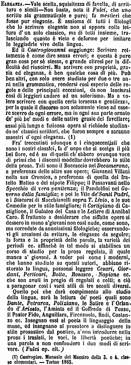 | Eleganza - Vale scelta, squisitezza di favella, di scrittura e simili - Non basta, nota il Fulci, che uno scritto sia grammaticale e puro; fa mestieri che fosse pur elegante. È assioma di tutti i filologi che lo scrivere elegante non si appara colla lettura d'un solo classico, ma di tutti insieme, tralasciando quanto è vieto e deforme per imitare le leggiadrìe vive della lingua.