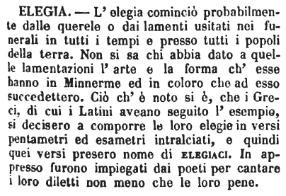 | Elegia - L'elegia cominciò probabilmente dalle querele o dai lamenti usitati nei funerali in tutti i tempi e presso tutti i popoli della terra. Non si sa chi abbia dato a quelle lamentazioni l'arte e la forma ch'esse hanno in Minnerme ed in coloro che ad esso succedettero. Ciò ch'è noto si è, che i Greci, di cui i Latini aveano seguito l'esempio, si decisero a comporre le loro elegie in versi pentametri ed esametri intralciati, e quindi quei versi presero nome di elegiaci. In appresso furono impiegati dai poeti per cantare i loro diletti non meno che le loro pene. [immagine] |