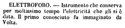 | Elettroforo - Istrumento che conserva per moltissimo tempo l'elettricità che gli si è data. Il primo conosciuto fu immaginato da Volta. [immagine] |