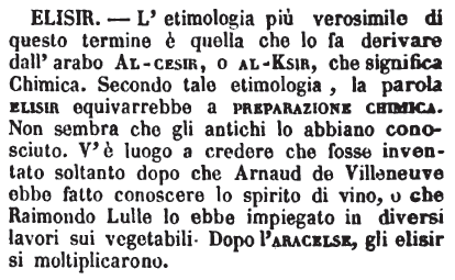 Elisir - L'etimologia più verosimile di questo termine è quella che lo fa derivare dall'arabo Al-cesir, o al-Ksir, che significa Chimica. Secondo tale etimologia, la parola elisir equivarrebbe a preparazione chimica. Non sembra che gli antichi lo abbiano conosciuto. V'è luogo a credere che fosse inventato soltanto dopo che Arnaud de Villeneuve ebbe fatto conoscere lo spirito di vino, o che Raimondo Lulle lo ebbe impiegato in diversi lavori sui vegetabili. Dopo l'aracelse, gli elisir si moltiplicarono. [immagine]