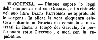 | Eloquenza - Platone espose le leggi dell'eloquenza nel suo Gorgias, ed Aristotele nel suo libro Della Rettorica ne approfondò le sorgenti. In allora la vera eloquenza esisteva soltanto in Grecia; ma cominciò a mostrarsi in Roma a tempo dei Gracchi, fu perfezionata sotto Cicerone, e morì con la repubblica. [immagine] |