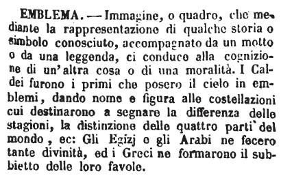 | Emblema - Immagine, o quadro, che mediante la rappresentazione di qualche storia o simbolo conosciuto, accompagnato da un motto o da una leggenda, ci conduce alla cognizione di un'altra cosa o di una moralità. I Caldei furono i primi che posero il cielo in emblemi, dando nome e figura alle costellazioni cui destinarono a segnare la differenza delle stagioni, la distinzione delle quattro parti del mondo, ec: Gli Egizj e gli Arabi ne fecero tante divinità, ed i Greci ne formarono il subietto delle loro favole. [immagine] |