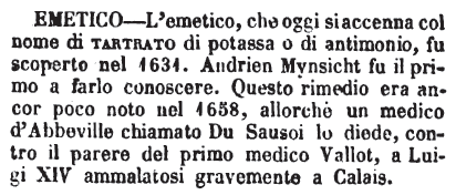 tartrato di potassa o di antimonio, fu scoperto nel 1631. Andrien Mynsicht fu il primo a farlo conoscere. Questo rimedio era ancor poco noto nel 1658, allorchè un medico d'Abbeville chiamato Du Sausoi lo diede, contro il parere del primo medico Vallot, a Luigi XIV ammalatosi gravemente a Calais. [immagine] |