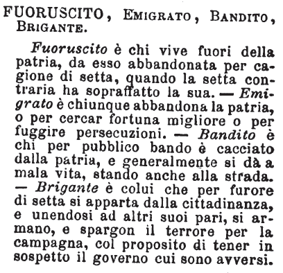 | Fuoriuscito, Emigrato, Bandito, Brigante - Fuoruscito è chi vive fuori della patria, da esso abbandonata per cagione di setta, quando la setta contraria ha sopraffatto la sua. - Emigrato è chiunque abbandona la patria, o per cercar fortuna migliore o per fuggire persecuzioni. - Bandito è chi per pubblico bando è cacciato dalla patria, e generalmente si dà a mala vita, stando anche alla strada. - Brigante è colui che per furore di setta si apparta dalla cittadinanza, e unendosi ad altri suoi pari, si armano, e spargon il terrore per la campagna, col proposito di tener in sospetto il governo cui sono avversi. [immagine] |