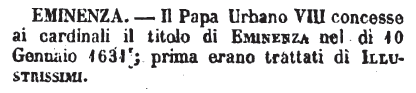 | Eminenza - Il Papa Urbano VIII concesse ai cardinali il titolo di Eminenza nel dì 10 Gennaio 1631; prima erano trattati dì Illustrissimi. [immagine] |