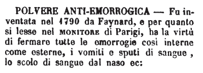 | Polvere anti-emorrogica - Fu inventata nel 1790 da Faynard, e per quanto si lesse nel monitore di Parigi, ha la virtù di fermare tutte le emorragie così interne come esterne, i vomiti e sputi di sangue, lo scolo di sangue dal naso ec: [immagine] |