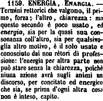 | Enfasi, Energia - La voce Energia, usata da molti, ma che sa di francese, come bene osserva il Tommaseo, parlandosi dello stile o del dire, ne accenna la forza e il vigore al maggior grado. - Enfasi è l'usare parole e modi di gran suono e con tono di solennità, quasi voglia farsi ad esse significare più di ciò che suonano naturalmente. [immagine] |