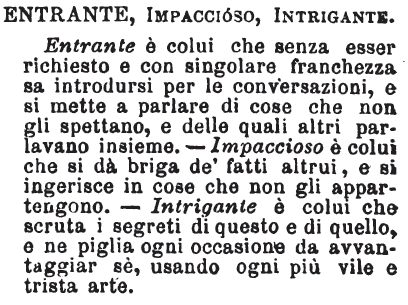 | Entrante, Impaccioso, Intrigante - Entrante è colui che senza esser richiesto e con singolare franchezza sa introdursi per le conversazioni, e si mette a parlare di cose che non gli spettano, e delle quali altri parlavano insieme. - Impaccioso è colui che si dà briga de' fatti altrui, e si ingerisce in cose che non gli appartengono. - Intrigante è colui che scruta i segreti di questo e di quello, e ne piglia ogni occasione da avvantaggiar sè, usando ogni più vile e trista arte. [immagine] |