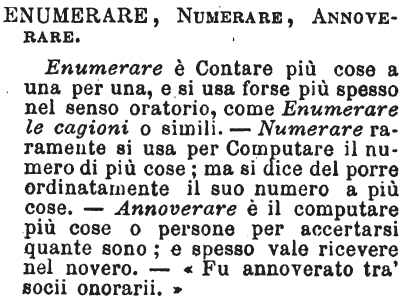 | Enumerare, Numerare, Annoverare - Enumerare è Contare più cose a una per una, e si usa forse più spesso nel senso oratorio, come Enumerare le cagioni o simili. - Numerare raramente si usa per Computare il numero di più cose; ma si dice del porre ordinatamente il suo numero a più cose. - Annoverare è il computare più cose o persone per accertarsi quante sono; e spesso vale ricevere nel novero. - «Fu annoverato tra' socii onorarii.» [immagine] |