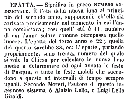[Cont.] Cr. B. Naut. med. III. 325. Altro non è l'Epatta che il numero dei giorni, con che l'anno solare commune di giorni 365 avanza l'anno commune della luna di giorni 354… E questi tali undici giorni, che agguagliano all'anno solare il computo delle dodeci lunazioni, è quello che si dice Epatta. [G.M.] Magri, Notiz. Vocab. Eccl. Il saper l'epatta serve ad uno Ecclesiastico non solo per aver notizia delle feste mobili, ma anco per conoscere quando fa la luna. Ogni anno, dunque, dell'epatta vecchia si aggiunge undici giorni per trovar la nuova, purchè non passi il termine di trenta, perchè allora l'eccesso sopra li trenta sarà l'epatta corrente.