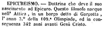| Epicureismo - Dottrina che deve il suo nascimento ad Epicuro. Questo filosofo nacque nell'Attica, in un borgo detto di Gargotta, l' anno 3.° della 109.a Olimpiade, ed in conseguenza 342 anni avanti Gesù Cristo. [immagine] |