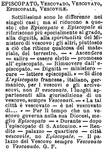 | Episcopato, Vescovado, Vescovato, Episcopale, Vescovile - Sottilissime sono le differenze nei singoli casi; ma si riducono a questo; che Episcopato e Episcopale si riferiscono più specialmente al grado, alla dignità, alla spiritualità del Ministero di vescovo; gli altri, piuttosto a ciò che ritiene qualcosa del materiale, del terrestre. - «Ascendere – salire – essere eletto – promosso all’episcopato. – Rimuovere dall’episcopato. – Dignità – ministero – cure – lettere episcopali.» - Si dice L’episcopato francese, italiano, germanico, per I vescovi e gli arcivescovi, non Il vescovato. I luoghi appartenenti alla giurisdizione di un vescovo, sempre Vescovati. - «La tal città è vescovato – è nel vescovato di….» - Per Il tempo che un vescovo governa nella sua Diocesi, meglio Episcopato - «Durante – dopo l’episcopato di S. Antonino.» - Rendite – palazzo – quartiere – città vescovile, no Episcopale. – Il palazzo del Vescovo sempre Vescovato o Vescovado. G. F. [immagine] |