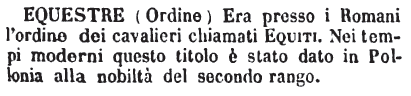 | Equestre (Ordine) - Era presso i Romani l'ordine dei cavalieri chiamati equiti. Nei tempi moderni questo titolo è stato dato in Polonia alla nobiltà del secondo rango. [immagine] |