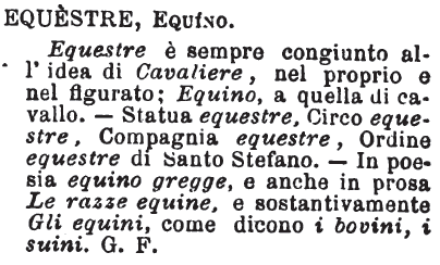 | Equestre, Equino - Equestre è sempre congiunto all'idea di Cavaliere, nel proprio e nel figurato; Equino, a quella di cavallo. - Statua equestre, Circo equestre, Compagnia equestre, Ordine equestre di Santo Stefano. - In poesia equino gregge, e anche in prosa Le razze equine, e sostantivamente Gli equini, come dicono i bovini, i suini. G. F. [immagine] |