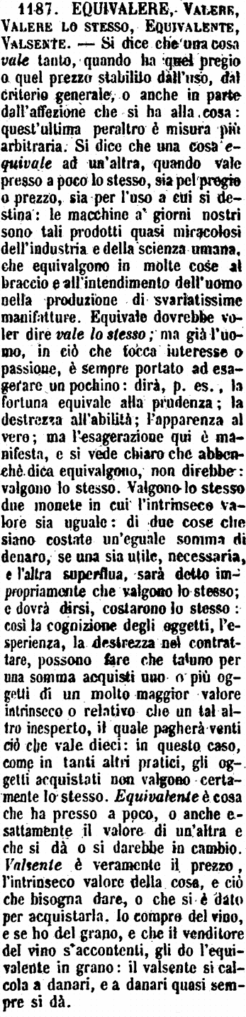 | Equivalere, Valere, Valere lo stesso, Equivalente, Valsente - Si dice che una cosa vale tanto, quando ha quel pregio o quel prezzo stabilito dall'uso, dal criterio generale, o anche in parte dall'affezione che si ha alla cosa: quest'ultima peraltro è misura più arbitraria. Si dice che una cosa equivale ad un'altra, quando vale presso a poco lo stesso, sia pel pregio o prezzo, sia per l'uso a cui si destina: le macchine a' giorni nostri sono tali prodotti quasi miracolosi dell'industria e della scienza umana, che equivalgono in molte cose al braccio e all'intendimento dell'uomo nella produzione di svariatissime manifatture. Equivale dovrebbe voler dire vale lo stesso; ma già l'uomo, in ciò che tocca interesse o passione, è sempre portato ad esagerare un pochino: dirà, p. es., la fortuna equivale alla prudenza; la destrezza all'abilità; l'apparenza al vero; ma l'esagerazione qui è manifesta, e si vede chiaro che abbenchè dica equivalgono, non direbbe: valgono lo stesso. Valgono lo stesso due monete in cui l'intrinseco valore sia uguale: di due cose che siano costate un'eguale somma di denaro, se una sia utile, necessaria, e l'altra superflua, sarà detto impropriamente che valgono lo stesso; e dovrà dirsi, costarono lo stesso: così la cognizione degli oggetti, l'esperienza, la destrezza nel contrattare, possono fare che taluno per una somma acquisti uno o più oggetti di un molto maggior valore intrinseco o relativo che un tal altro inesperto, il quale pagherà venti ciò che vale dieci: in questo caso, come in tanti altri pratici, gli oggetti acquistati non valgono certamente lo stesso. Equivalente è cosa che ha presso a poco, o anche esattamente il valore di un'altra e che si dà o si darebbe in cambio. Valsente è veramente il prezzo, l'intrinseco valore della cosa, e ciò che bisogna dare, o che si è dato per acquistarla. Io compro del vino, e se ho del grano, e che il venditore del vino s'accontenti, gli do l'equivalente in grano: il valsente si calcola a danari, e a danari quasi sempre si dà. [immagine] |