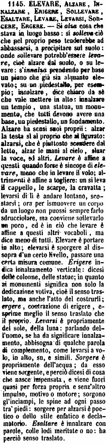 | Elevare, Alzare, Innalzare, Erigere, Sollevare, Esaltare, Levare, Levarsi, Sorgere, Ergere - Si alza cosa che stava in luogo basso: si solleva ciò che pel proprio peso tenderebbe ad abbassarsi, a precipitare sul suolo: onde sollevare potrebb'essere levare, cioè alzare dal suolo, o su levare: s'innalza prendendo per base un piano che già sia alquanto elevato; su un piedestallo, per esempio; innalzare, dice chiaro da sè che vale mettere in alto: innalzare un tempio, una statua, un monumento, che tutti devono avere una base, un piedestallo, un fondamento. Alzare ha sensi suoi proprii: alzar la testa sì al proprio che al figurato: alzarsi, che è piuttosto scendere dal letto, alzar le mani al cielo, alzar la voce, ed altri. Levare è affine a questi quando forse è sincope di elevare, meno che in levare il volo; altrimenti è affine a togliere: un si leva il cappello, le scarpe, la cravatta; levarsi di lì è andare lontano, scostarsi; ora per ismuovere un corpo da un luogo non puossi sempre farlo sdrucciolare, ma conviene sollevarlo un poco, ed è in ciò che levare è affine a questi altri vocaboli, ma dice meno di tutti. Elevare è portare in alto; elevarsi è sporgere al dissopra d'un certo livello, passare una certa misura comune. Erigere indica innalzamento verticale: dicesi delle colonne, delle statue; in quanto ai monumenti significa non solo la dedicazione votiva, cioè il senso traslato, ma anche l'atto del costrurli; ergere, contrazione di erigere, esprime meglio il senso traslato che il proprio. Levarsi è propriamente del sole, della luna: parlando dell'uomo, se ha da significare innalzamento, abbisogna di qualche parola di complemento, come levarsi a volo, in alto, su, e simili. Sorgere è propriamente dell'acqua; da esso viene sorgente, e perciò dicesi di cosa che nasce impensata, e viene fuori quasi per forza propria e senz'altro impulso, motivo o motore; sorgono gl'inciampi, le spine ad ogni passo tra' piedi: sorgere per alzarsi è poetico o dello stile enfatico e declamatorio. Esaltare è innalzare con parole, colle lodi meritate o no: ha perciò senso traslato. [immagine] |