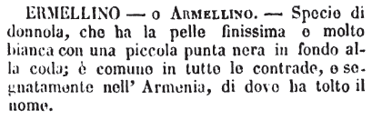 | Ermellino o Armellino - Specie di donnola, che ha la pelle finissima e molto bianca con una piccola punta nera in fondo alla coda; è comune in tutte le contrade, e segnatamente nell'Armenia, di dove ha tolto il nome. [immagine] |