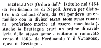 | Ermellino (Ordine dell’) - Istituito nel 1464 da Ferdinando re di Napoli. Aveva per distintivo una collana d'oro, da cui pendeva un ermellino con la divisa: malo mori quam foedari (preferisco morire ad essere macchiata). Anche in Brettagna eravi un ordine di cavalleria dello stesso nome, istituito o rinnovato verso il 1365. da Ferdinando V il valoroso, duca di Brettagna. [immagine] |