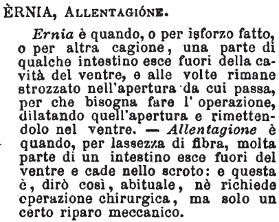 | Ernia - S. f. (Chir.) Sorta di malattia, ed è l'uscire d'alcun viscere, e specialmente delle intestina, dal proprio luogo naturale, e dalla cavità che le contiene, entrando in un'altra cavità artificiale, che fa protuberanza all'esterno; ed è di più sorte. Rispetto a' varii stati in cui possono trovarsi gli organi contenuti nelle ernie, dicesi Ernia riducibile quella che scompare facilmente pel ritirarsi in dentro dei visceri; Ernia irreducibile quella, nella quale questi visceri stessi contrassero aderenze, o acquistarono certe disposizioni che li ritengono fuori di sito; finalmente Ernia strangolata quella, in cui gli organi compressi dall'apertura che lasciò il morboso passo, o da qualche altra parte del loro immediato inviluppo s'infiammano e si strangolano. Dal gr. Ἔρνος, Ramo, perchè quando l'intestino comincia a cader nello scroto, sembra che formi de' rami. (Mt.) È in Cels. – Lib. cur. malatt. (C) Da questi eccedenti sforzi nasce l'ernia del bellico, che volgarmente si dice allentatura. E altrove: Lo empiastro di questa erba vale molto a tutte le ernie, e le sana. Ar. Supp. 2. 4. Dice che vi puzzano Li piedi e le ditella…, che vi pende l'ernia.