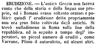 | Erudizione - L'antica Grecia non faceva conto che della storia e della lingua sue proprie, ed i Romani erano soltanto oratori e politici: quindi l'erudizione detta propriamente non era gran fatto coltivata dagli antichi. Si trovò nulladimeno in Roma sulla fine della repubblica, ed in seguito a tempo degl'imperatori, un piccol numero di eruditi, come Varrone, Plinio il naturalista, ed alcuni altri. [immagine] |