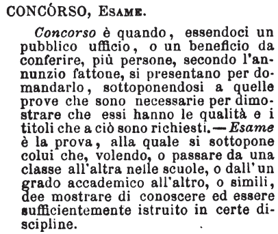| Concorso, Esame - Concorso è quando, essendoci un pubblico ufficio, o un beneficio da conferire, più persone, secondo l'annunzio fattone, si presentano per domandarlo, sottoponendosi a quelle prove che sono necessarie per dimostrare che essi hanno le qualità e i titoli che a ciò sono richiesti. - Esame è la prova, alla quale si sottopone colui che, volendo, o passare da una classe all'altra nelle scuole, o dall'un grado accademico all'altro, o simili, dee mostrare di conoscere ed essere sufficientemente istruito in certe discipline. [immagine] |