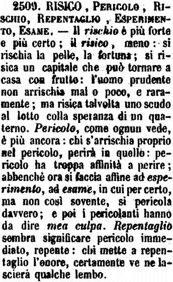 | Risico, Pericolo, Rischio, Repentaglio, Esperimento, Esame - Il rischio è più forte e più certo; il risico, meno: si rischia la pelle, la fortuna; si risica un capitale che può tornare a casa con frutto: l'uomo prudente non arrischia mai o poco, e raramente; ma risica talvolta uno scudo al lotto colla speranza di un quaterno. Pericolo, come ognun vede, è più ancora: chi s'arrischia proprio nel pericolo, perirà in quello: pericolo ha troppa affinità a perire; abbenchè ora si faccia affine ad esperimento, ad esame, in cui per certo, ma non così sovente, si pericola davvero; e poi i pericolanti hanno da dire mea culpa. Repentaglio sembra significare pericolo immediato, repente: chi mette a repentaglio l'onore, certamente ve ne lascierà qualche lembo. [immagine] |