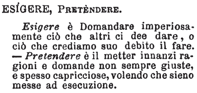 (Tom.) Si esige per riscuotere, non sempre si ottiene. E si può riscuotere senza esigere. – Si esige domandando, facendo gli atti necessarii a ottenere il suo, o quel che suo si pretende.