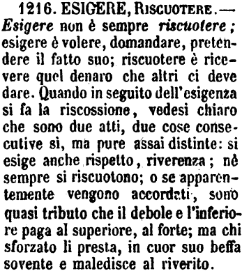 | Esigere, Riscuotere - Esigere non è sempre riscuotere; esigere è volere, domandare, pretendere il fatto suo; riscuotere è ricevere quel denaro che altri ci deve dare. Quando in seguito dell'esigenza si fa la riscossione, vedesi chiaro che sono due atti, due cose consecutive sì, ma pure assai distinte: si esige anche rispetto, riverenza; nè sempre si riscuotono; o se apparentemente vengono accordati, sono quasi tributo che il debole e l'inferiore paga al superiore, al forte; ma chi sforzato li presta, in cuor suo beffa sovente e maledisce al riverito. [immagine] |