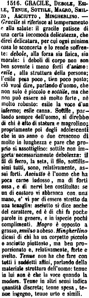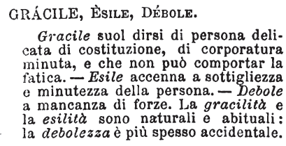 | Gracile, Esile, Debole - Gracile suol dirsi di persona delicata di costituzione, di corporatura minuta, e che non può comportar la fatica. - Esile accenna a sottigliezza e minutezza della persona. - Debole a mancanza di forze. La gracilità e la esilità sono naturali e abituali: la debolezza è più spesso accidentale. [immagine] |