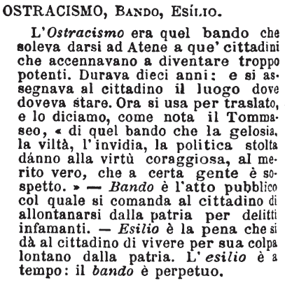 | Ostracismo, Bando, Esilio - L'Ostracismo era quel bando che soleva darsi ad Atene a que' cittadini che accennavano a diventare troppo potenti. Durava dieci anni: e si assegnava al cittadino il luogo dove doveva stare. Ora si usa per traslato, e lo diciamo, come nota il Tommaseo, «di quel bando che la gelosia, la viltà, l'invidia, la politica stolta dánno alla virtù coraggiosa, al merito vero, che a certa gente è sospetto.» - Bando è l'atto pubblico col quale si comanda al cittadino di allontanarsi dalla patria per delitti infamanti. - Esilio è la pena che si dà al cittadino di vivere per sua colpa lontano dalla patria. L'esilio è a tempo: il bando è perpetuo. [immagine] |